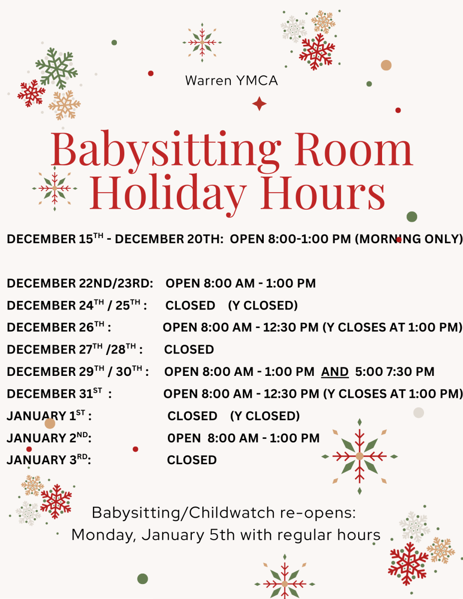 A childwatch service for children six (6) weeks to ten (10) years of age is offered to YMCA participants while they are using the facility (must remain inside the YMCA). Please, no parents in the room while staffed for babysitting. Hours are listed below and are subject to change due to low enrollment. THIS IS A NUT-FREE ROOM.
