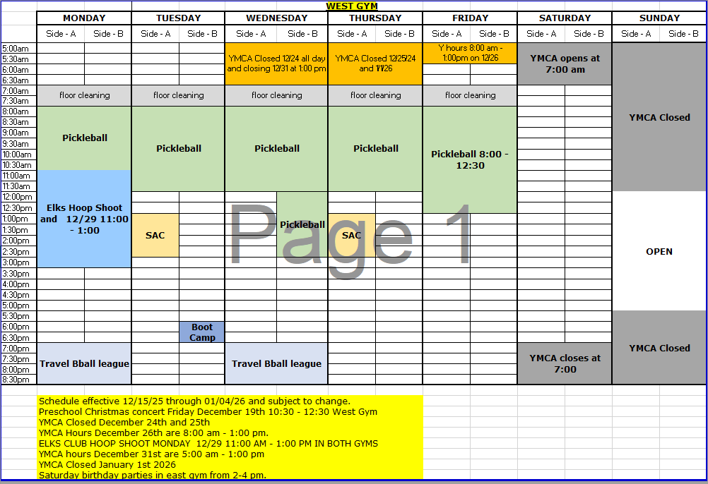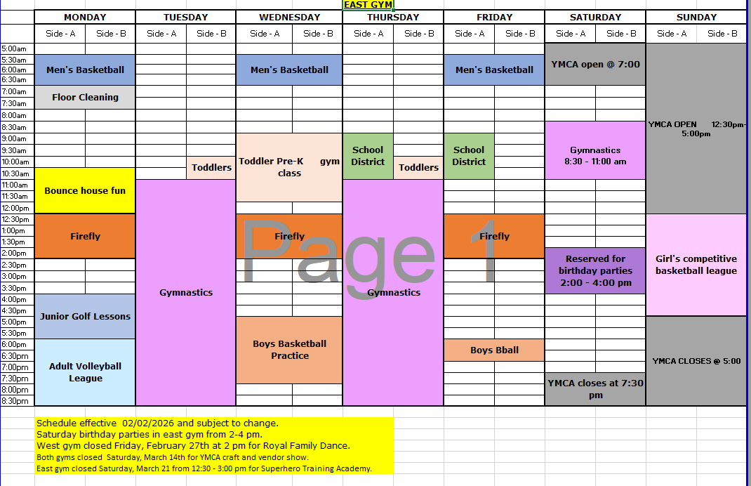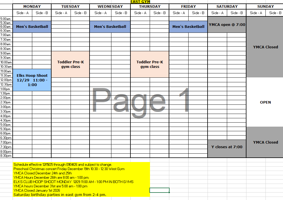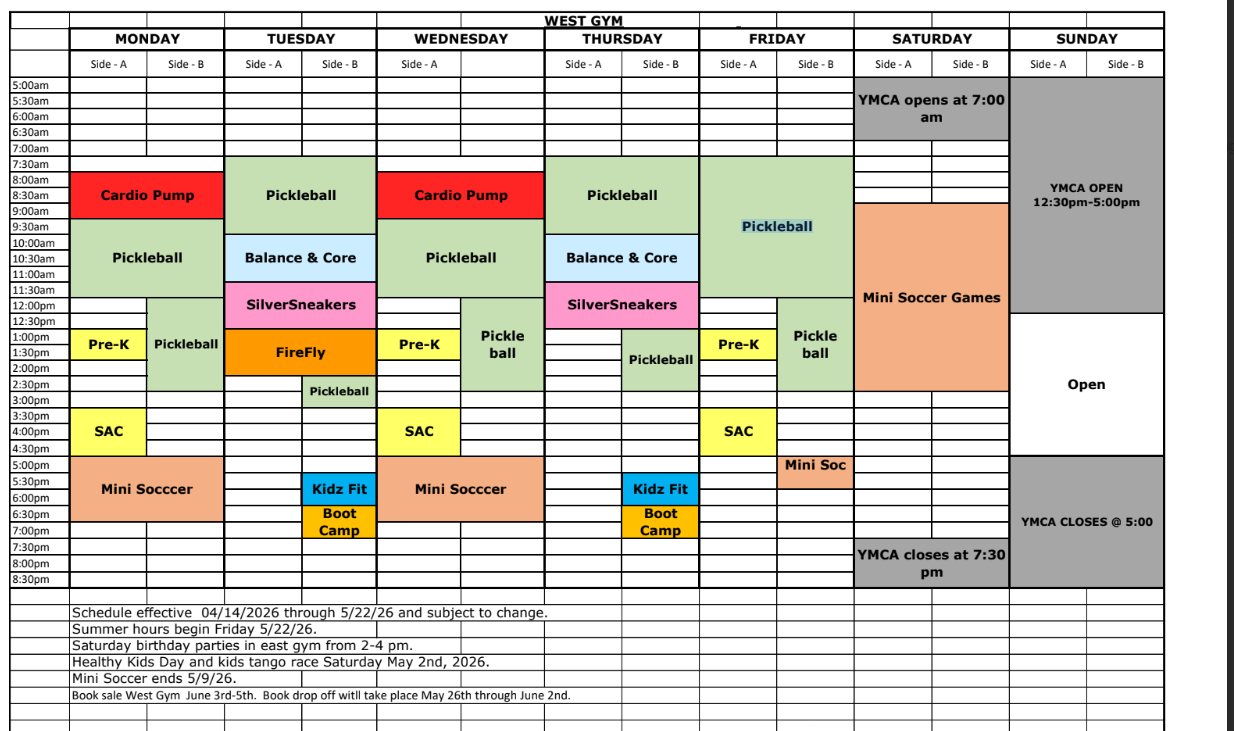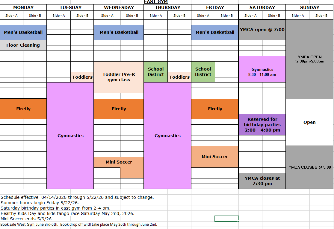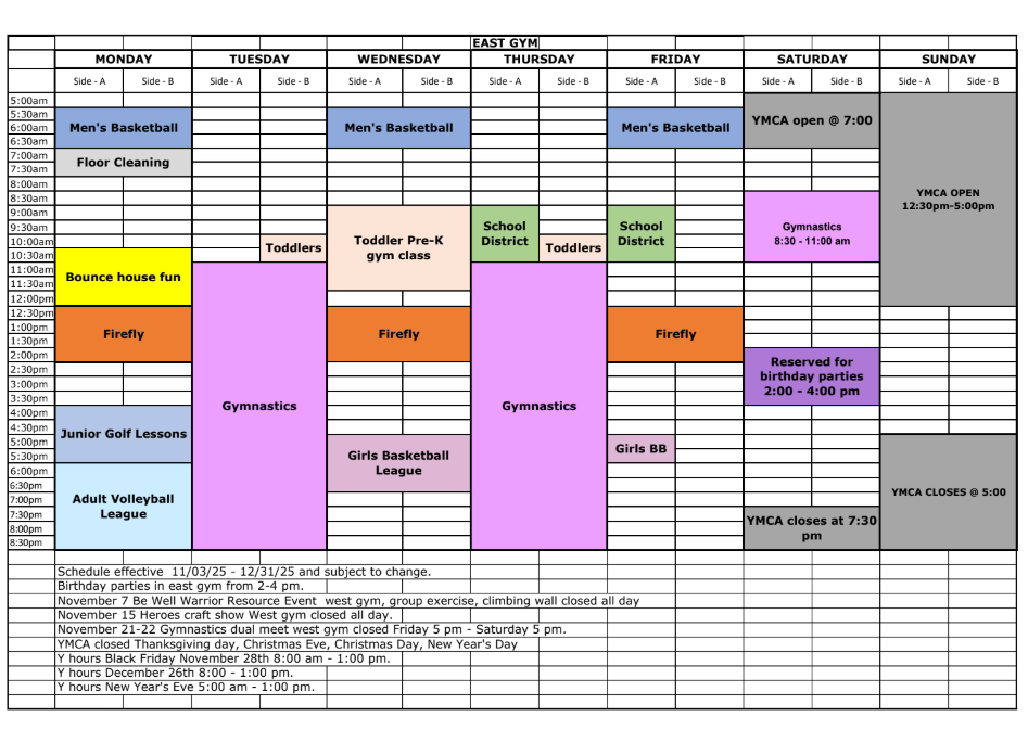 The YMCA has two full-size gymnasiums with six 10’ regulation hoops in each gym. Feel free to come in during open gym and shoot around. Basketballs are available to check out at the Front Welcome Desk with your Y Membership Card or day pass.